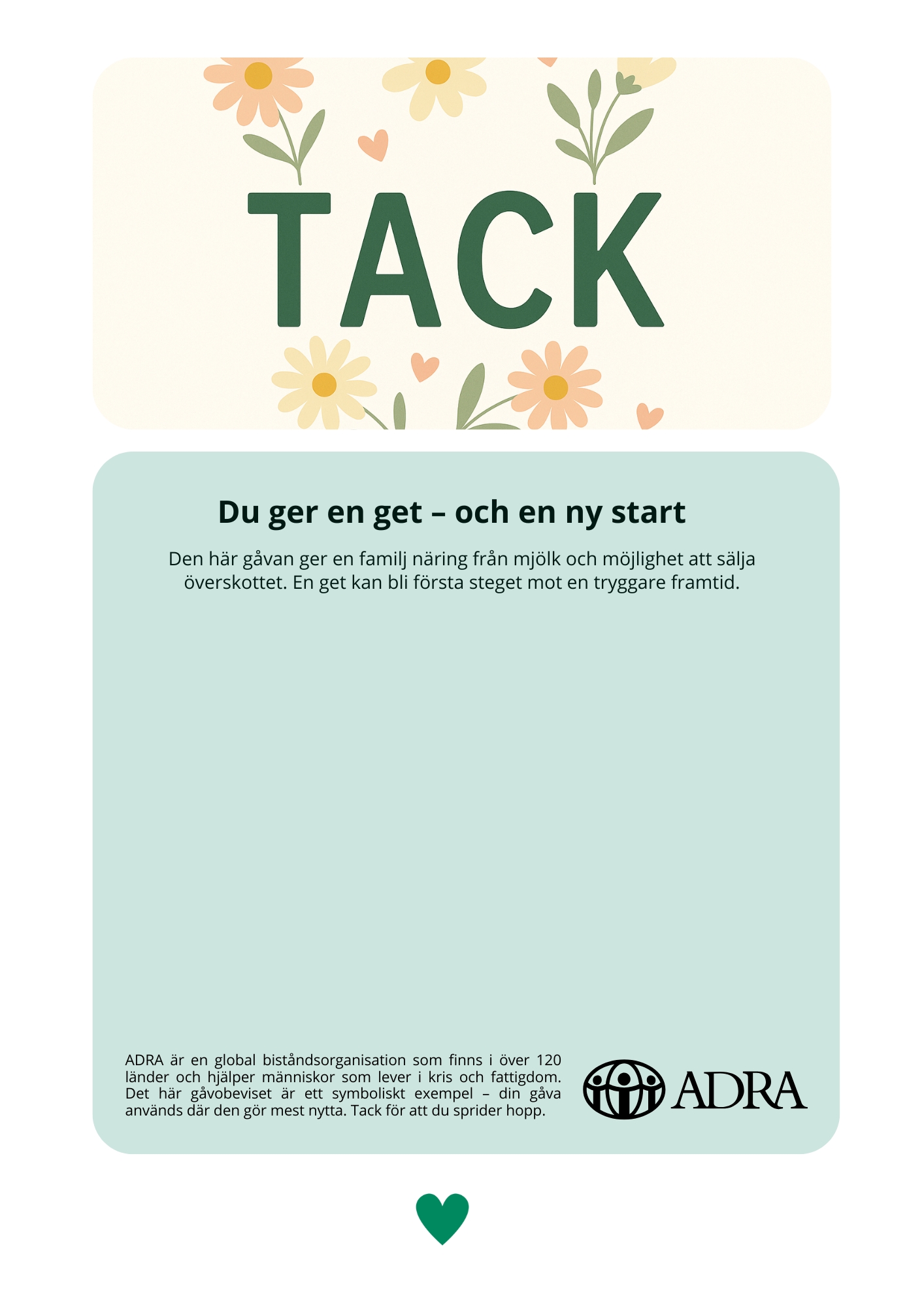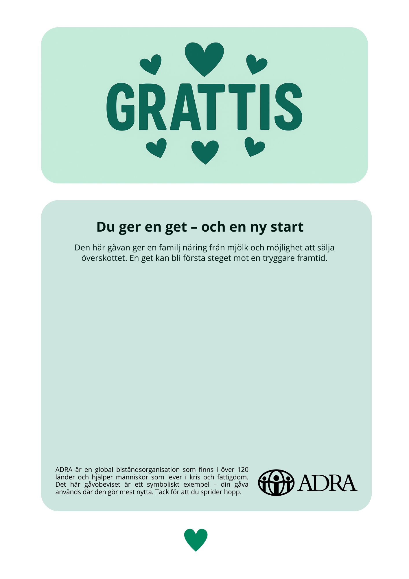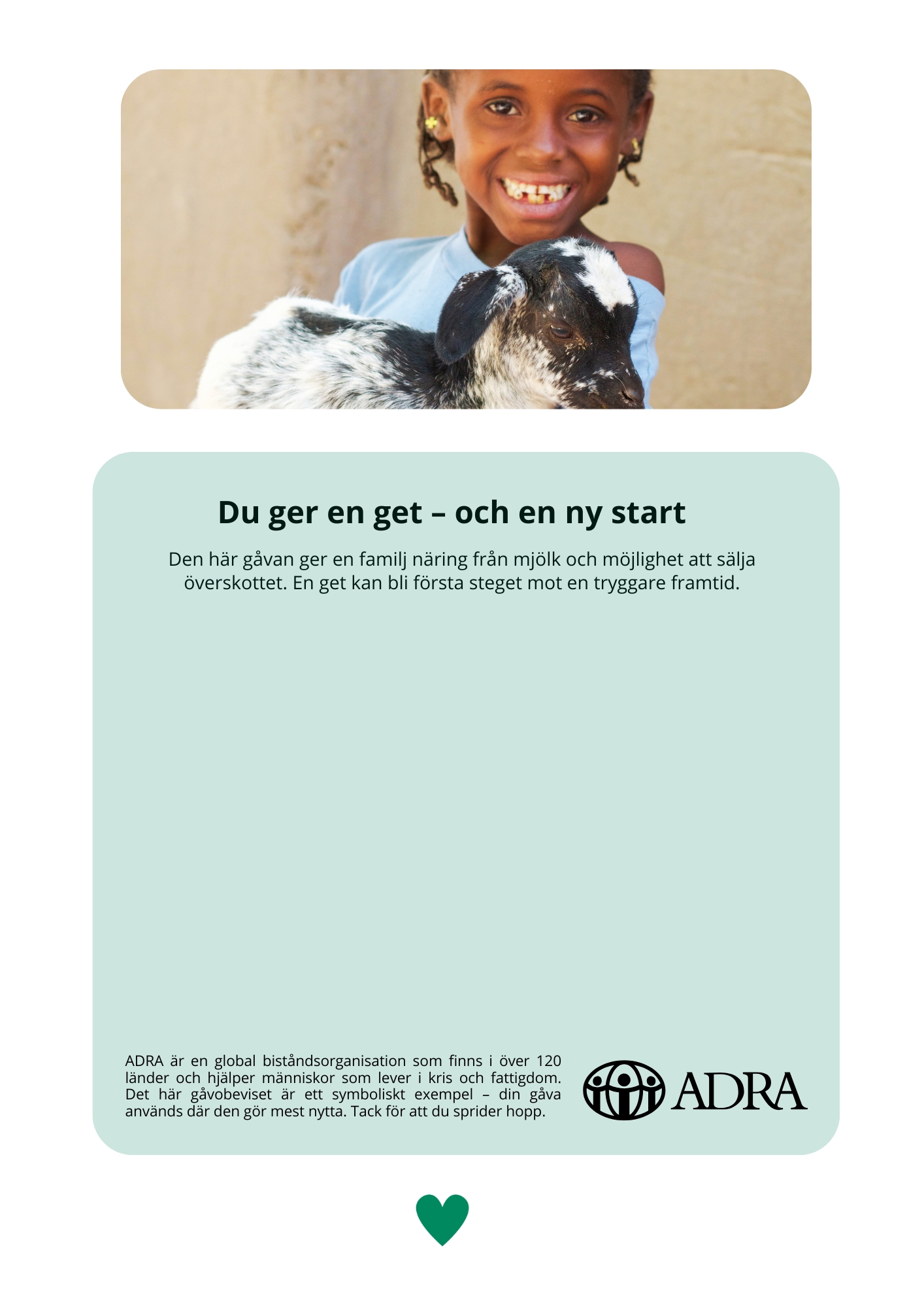 Din gåva ger en familj tillgång till färsk mjölk, näring till barnen och möjligheten att sälja överskottet på marknaden. Det blir en källa till både mat och inkomst, och ofta det första steget mot ekonomisk självständighet.