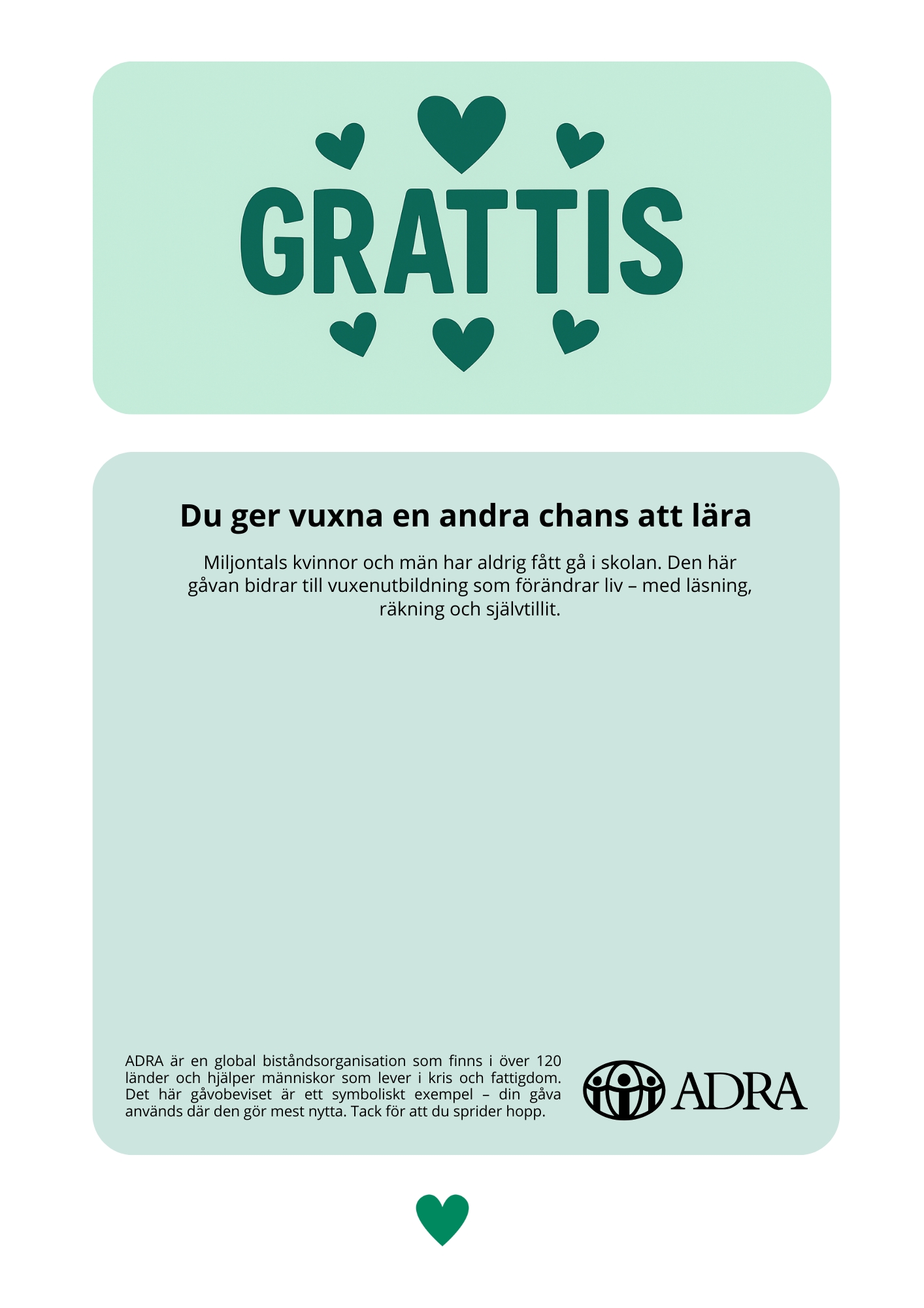 När du ger den här gåvan investerar du inte bara i en enskild persons framtid – du bidrar till förändring för hela familjer och byar. Tack för att du ger människor en ny chans i livet.