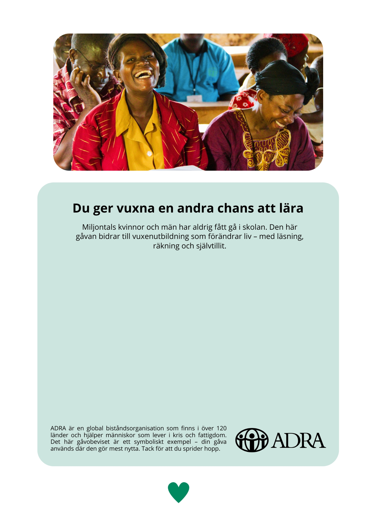 Din gåva ger kvinnor och män möjlighet att börja om. Genom ADRA:s vuxenutbildning får de grundläggande kunskaper, lär sig ta kontroll över sin ekonomi och stärker sin roll i familjen och samhället.