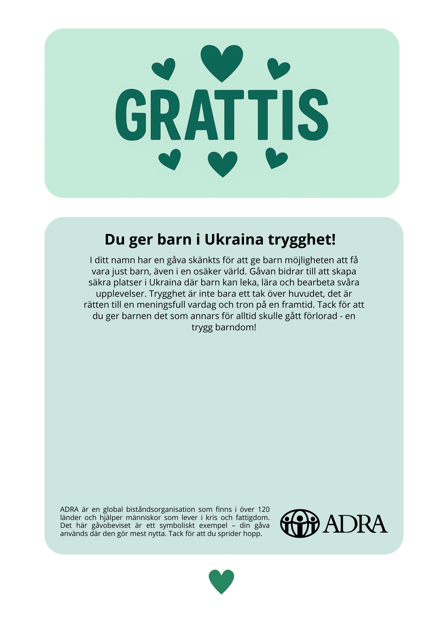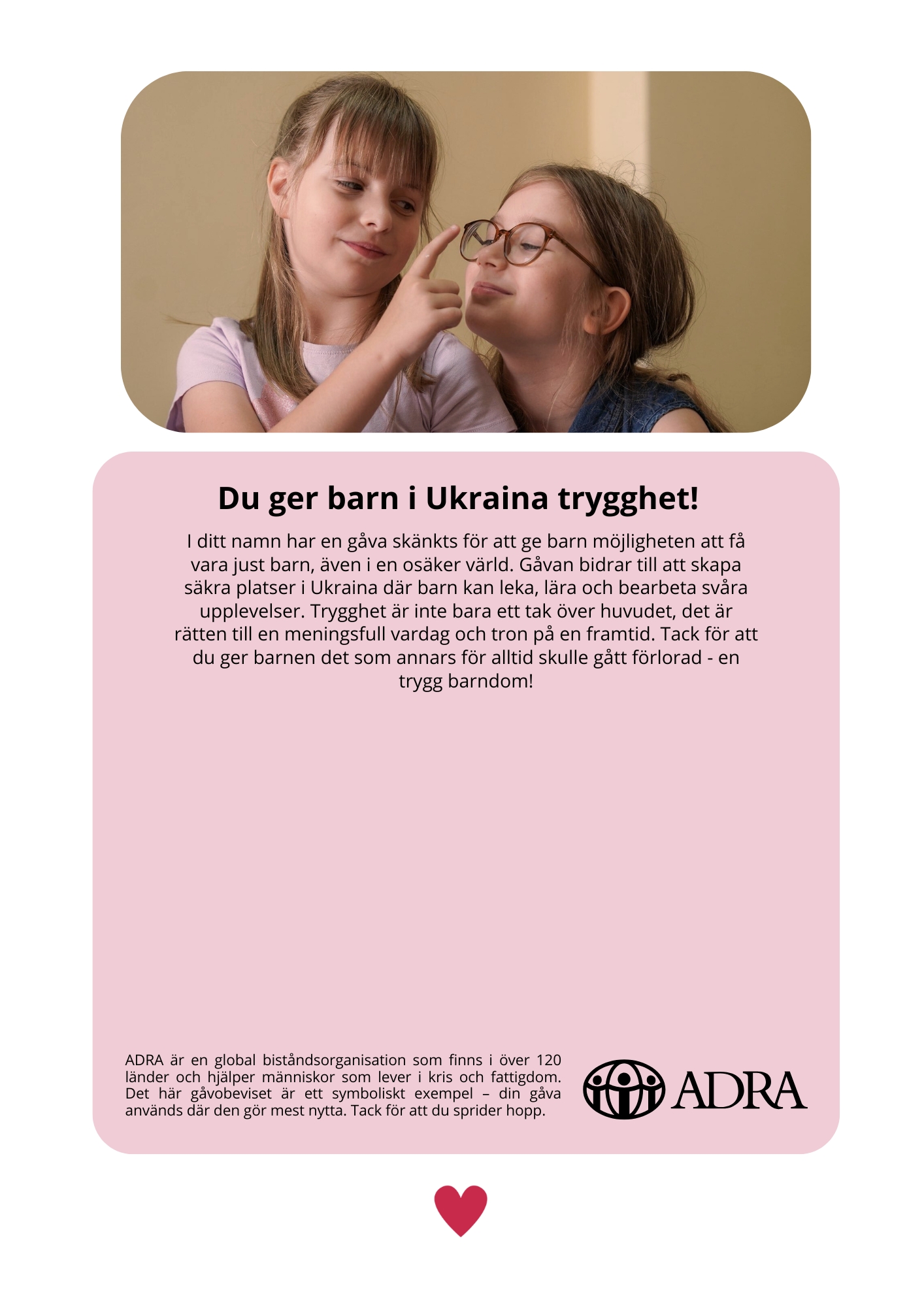 Krig och oro stjäl barns barndom. Men med din gåva kan vi ge den tillbaka. Genom att skapa trygga platser mitt i osäkerheten ger du barn i Ukraina en chans att leka, lära och bara få vara barn för en stund. Din gåva hjälper till att läka osynliga sår genom professionellt stöd och en meningsfull vardag. Det är kärlek som ger styrka att orka vidare.
