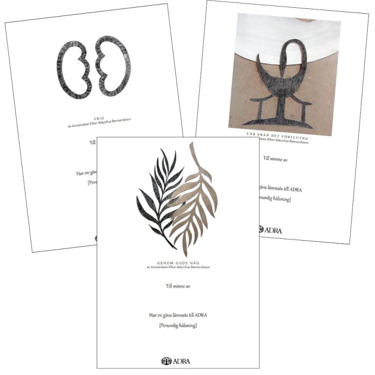 Till ADRA:s minnesblad har Ellen hämtat inspiration från Adinkra – ett traditionellt symbolsystem från Ghana som bär på djupa budskap om livsvisdom, värderingar och ordspråk. Varje symbol är en visuell påminnelse om mänskliga erfarenheter och universella principer.